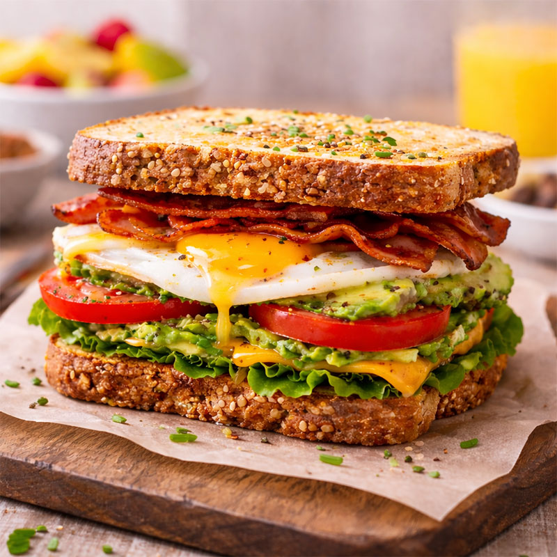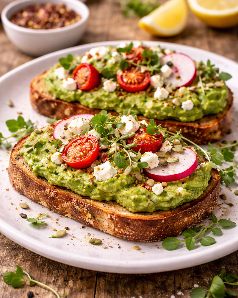 Pâine integrală, avocado cremos, ou ochi și microplante.